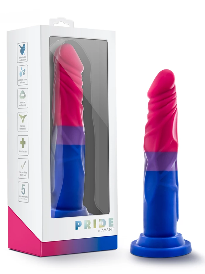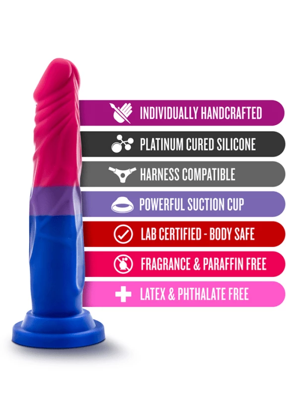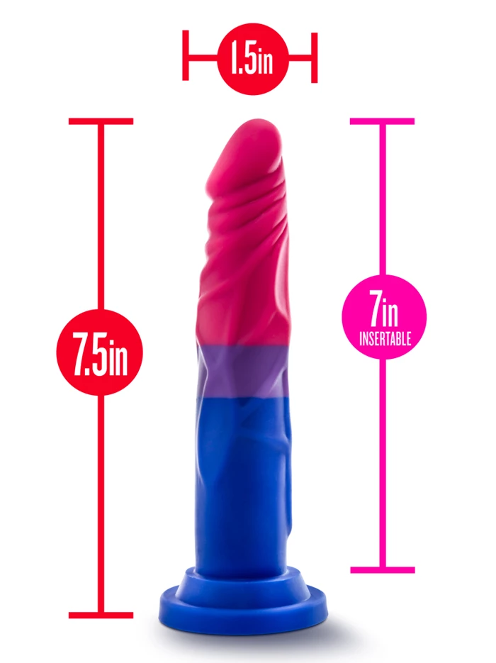 Harness your pride with a suction-base color-banded silicone dildo in the pink, purple and blue of the bisexual flag. The suction cup that adheres easily to smooth flat surfaces, so you can enjoy hands-free penetration as well as fantasy threesome scenarios. Designed with a straight, slim, vein-textured shaft featuring a realistic head that tapers at the tip for easy insertion; the texturing increases towards the head so you can enjoy increased stimulation during penetration. Clean with mild soap and toy cleanser or boil to sanitize. 5-Year warranty.