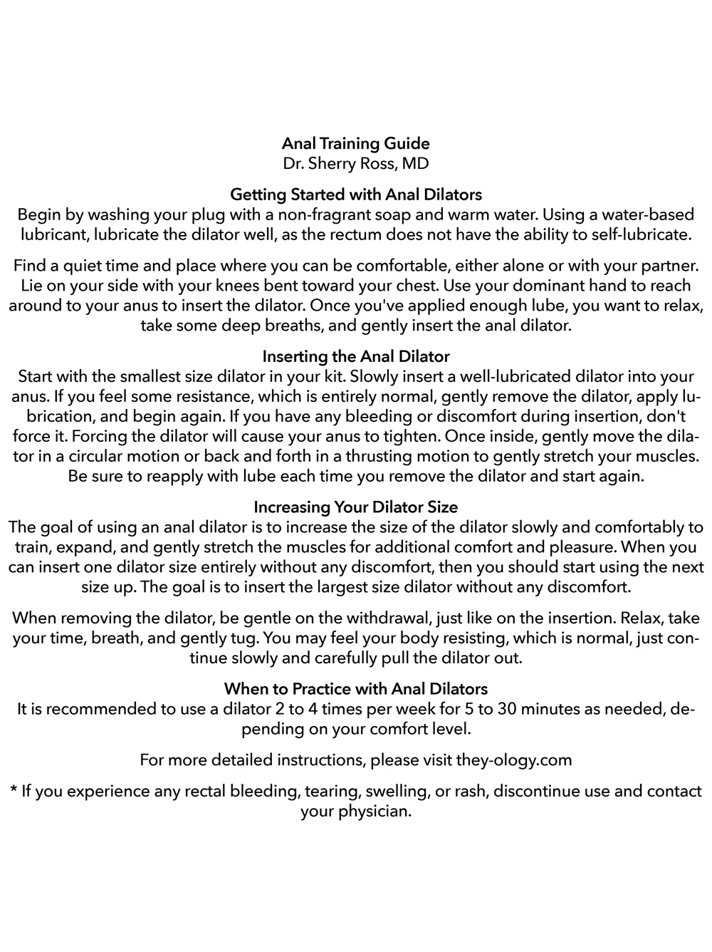 Everybody has a butt and it’s time to put yours to work! Ease yourself into the wonderful world of anal stimulation with the They-Ology 5-Piece Wearable Training Set. This unique set includes a set of 5 wearable anal training plugs that’ll help you safely and comfortably increase pleasure with every use. The wings on the base of each probe are designed to fit comfortably between your cheeks during use.