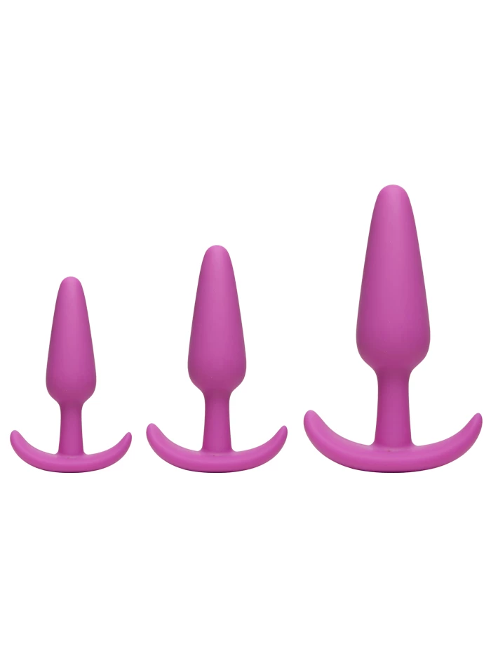 This trio of tapered silicone anal plugs in graduated sizes allow users to start small and size up. Firm yet flexible, they’re a great shape for beginner anal play – tapered at tip for ease of insertion, they’re smooth and feature a cradle-like base that allows for comfortable wear, even for more extended periods of time. They work well for double penetration and use with other toys, too! Clean with mild soap and water.