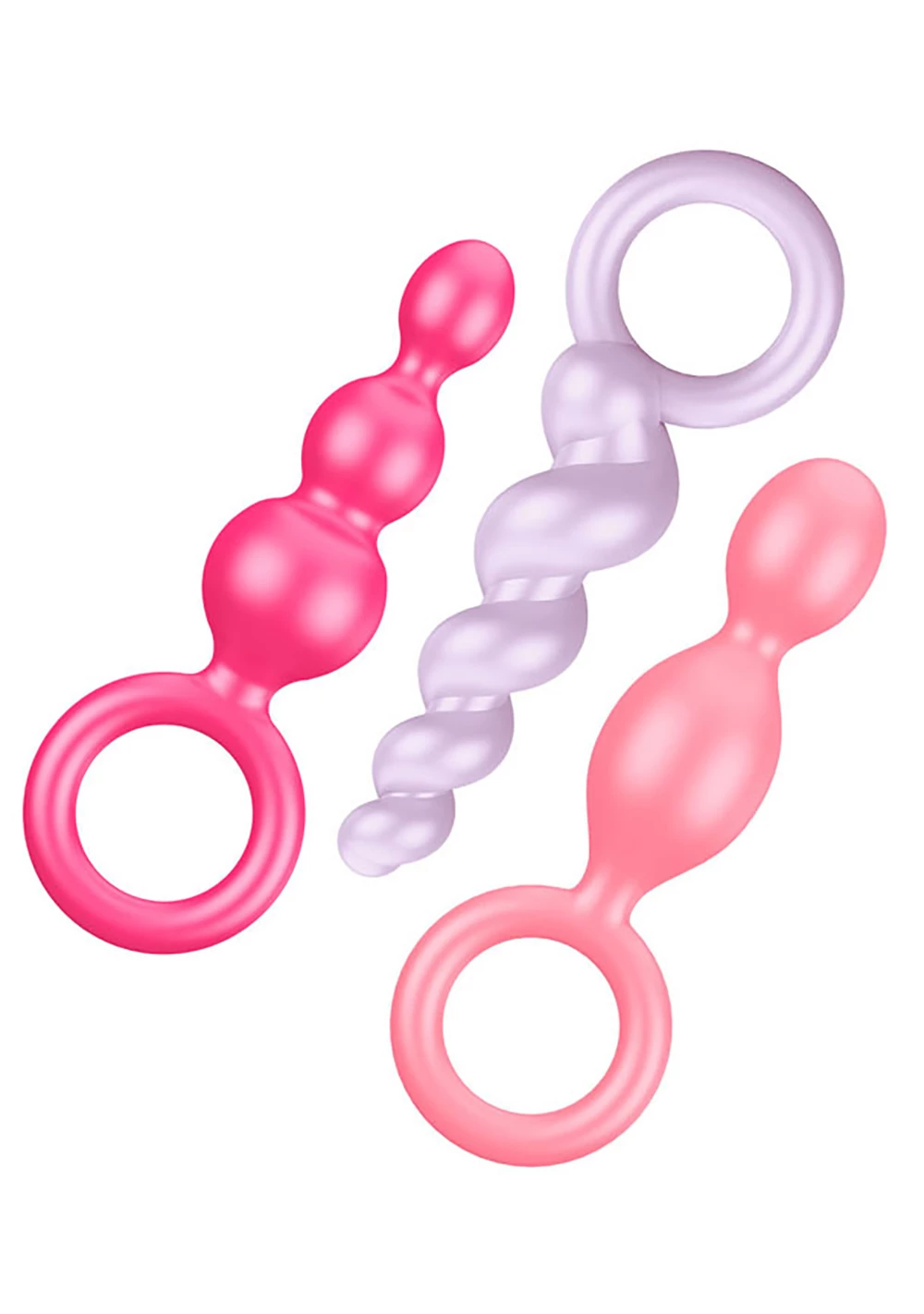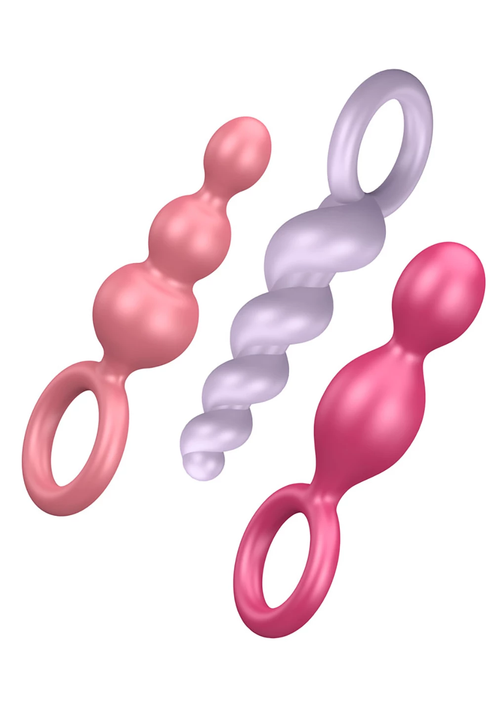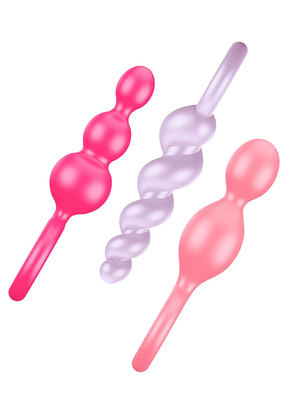 One, two, or three? If you are looking for an exciting range of sensual, feel-good massage games for your back passage, this sexy trio is perfect for your next anal adventure. The flexible plugs are made from medical grade silicone, caressing your anus with a soft-to-touch surface. Thanks to their narrow tips and smooth, ultra-soft texture, they are also perfect for beginners & explorers. Choose between a seductively twisted spiral design, a narrow cone shaped or the ‘classic’ design which consists of balls of increasing sizes. The brightly coloured set offers a variety of sensations, adding a range of sensual pleasures to your love games whether you’re enjoying a steamy solo session or passionate playtime with your partner. Discover the exciting mix of different, ascending structures and train your back passage in a particularly fun-filled fashion. The exciting back-and-forth lets you enjoy every inch, while the frictionless glide of the plugs will stimulate you in an unforgettably intense manner. If you wear one of these flexible pleasure-givers as a plug, the different structures will caress you with every movement while leaving your hands free – what you do with them is up to your erotic imagination!