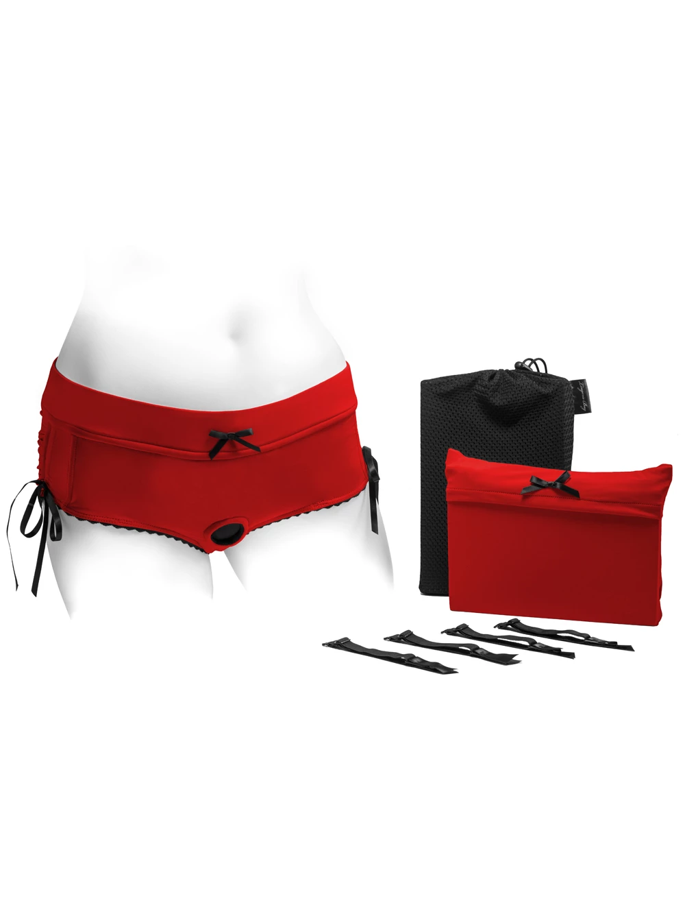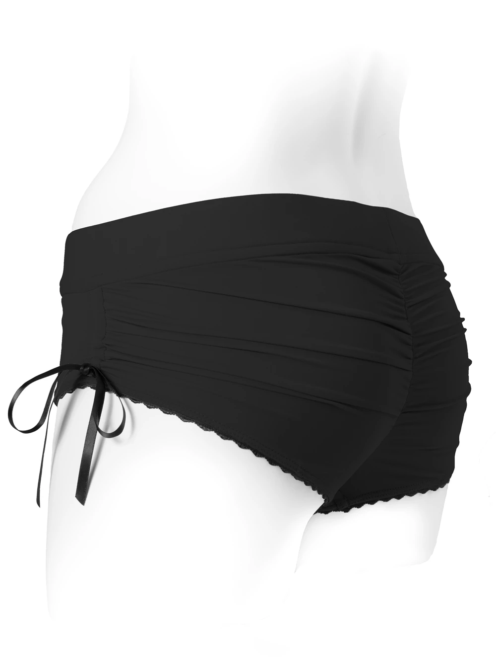 High fashion meets seductive sensuality with the alluring Sasha strap-on harness. Designed to accommodate dildos ranging from 1 ¼ to 2 ¼ inches in diameter, Sasha’s two internal fabric panels offer the option of extra padding between dildo and skin, while two mini-vibe-sized pouches are positioned to pleasure both partners! Made with both function and fashion in mind, this gorgeous couture-inspired harness features stretchy fabric that holds its shape, while detachable garters, decorative trim and ruched accents add additional allure. As easy to wear as lingerie, ribbon ties convert Sasha from booty short style to a high cut panty, and the nylon-spandex material provides cool comfort for all day wear. Sturdy and sexy, the Sasha Harness is an inspired choice for your intimate adventures.