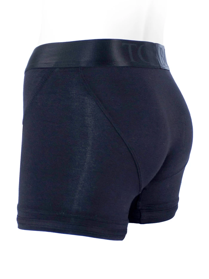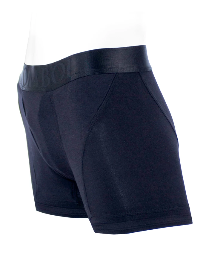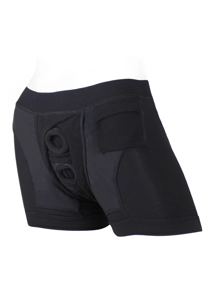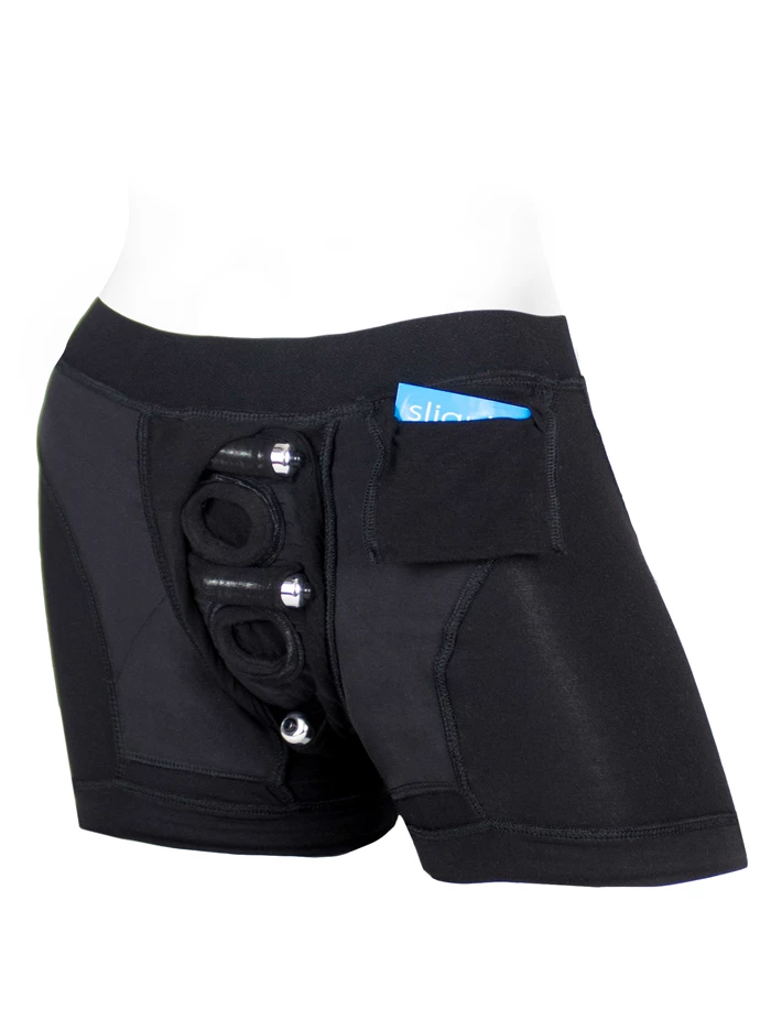 You’ll be sexy, stylish and secure in this Spareparts’ harness modeled after their popular, cute and oh-so-comfy Tomboi underwear-design brief version. Tomboii sports two elastic O-rings that securely fits toys 1.25 – 2.25 inches in diameter and are designed to not lose their shape. Great for double penetration, but also designed to make sure your dildo fits perfectly given varying body shapes. Choose to use either higher or lower ring, as your preference and fit dictate. Add to the fun with three internal mini-vibe pockets (bullet vibes sold separately) located in varying areas (place your vibe wherever it works best with your own anatomy) and a hip pocket for storing condoms or lube samples. All this action fits smoothly under a discreetly-styled fabric (compatible with water-friendly play) which makes the harness look like a standard jersey knit boxer from the front. The Tomboii’s fit is so good it can be worn under clothing for all-day comfort and still leave you ready for anything—its internal securing strap is perfect for packing, pack and play, sliding on and off smoothly (no fussing with buckles or straps). Great for dildos with balls and without, and for double dildos too!