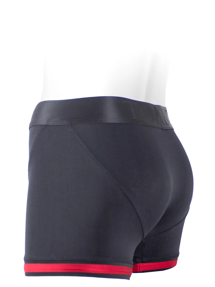 You’ll be sexy, stylish and secure in this Spareparts’ harness modeled after their popular, cute and oh-so-comfy Tomboi underwear-design brief version. Tomboii sports two elastic O-rings that securely fit toys 1.25 – 2.25 inches in diameter and are designed to not lose their shape. Great for double penetration, but also designed to make sure your dildo fits perfectly given varying body shapes. Choose to use either higher or lower ring, as your preference and fit dictate. Add to the fun with three internal mini-vibe pockets (bullet vibes sold separately) located in varying areas (place your vibe wherever it works best with your own anatomy) and a hip pocket for storing condoms or lube samples. All this action fits smoothly under a discreetly-styled fabric (compatible with water-friendly play) which makes the harness look like a standard jersey knit boxer from the front. The Tomboii’s fit is so good it can be worn under clothing for all-day comfort and still leave you ready for anything—its internal securing strap is perfect for packing, pack and play, sliding on and off smoothly (no fussing with buckles or straps). Great for dildos with balls and without, and for double dildos too!