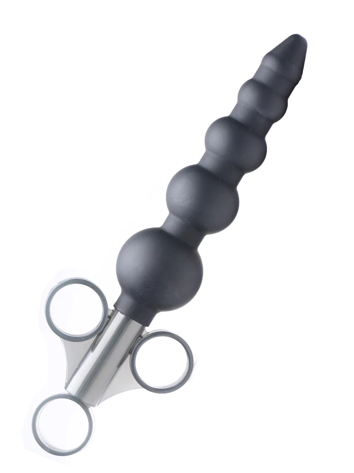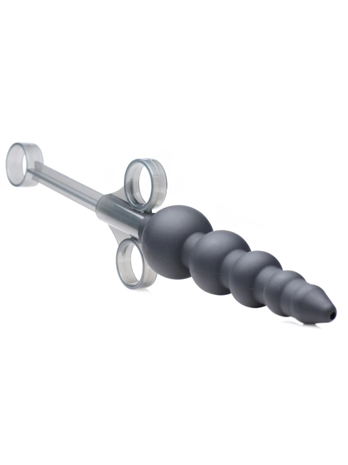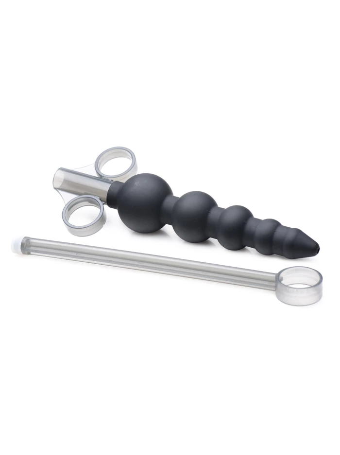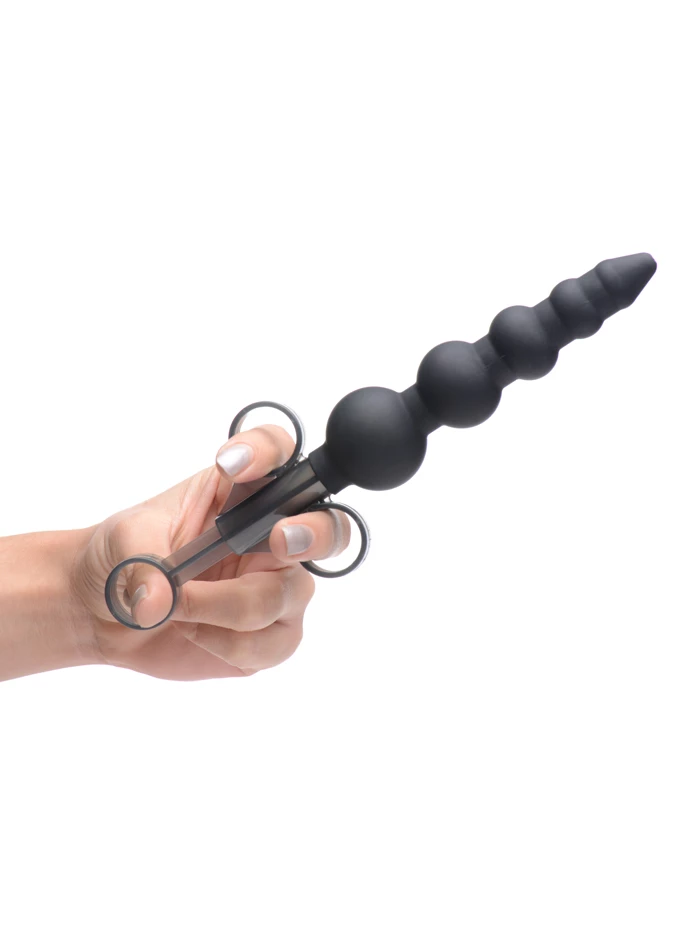 This unique, graduated-bead lube shooter adds extra pleasure to the process of getting lube where you want it! Use before anal sex or toy play—tapered at the end for ease of insertion, it’s designed with four beads that gradually increase in size. The interior of the lube launcher is ABS plastic; the external beads are made of silicone so it’s easy to clean your shooter with mild soap or toy cleanser (rinse well; do not boil). Finger grips let you use it one-handed, and it holds over two times the amount of lube as a standard shooter. It’s a great option for travel as well as at-home play!